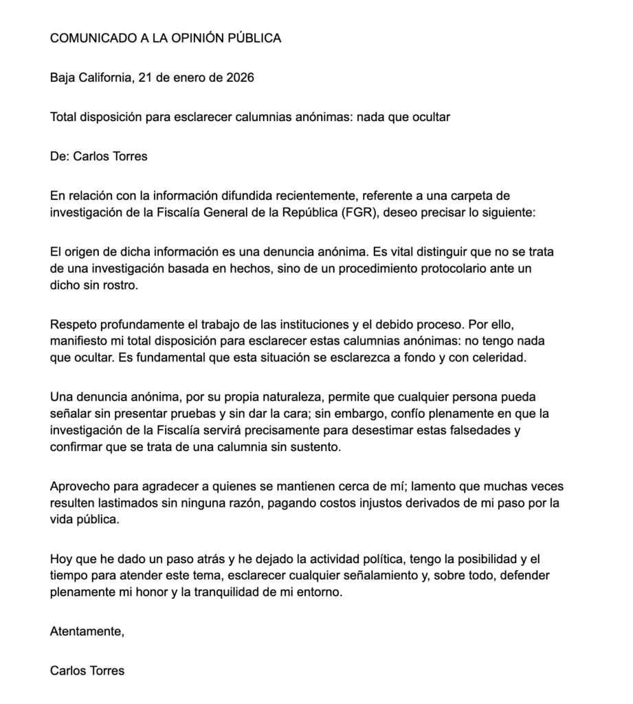En su misiva dirigida a los medios, Torres Torres afirmó que la indagatoria de la FGR “no se trata de una investigación basada en hechos, sino de un procedimiento protocolario ante un dicho sin rostro”, aunque no negó la existencia de la investigación difundida por el medio mexicano.