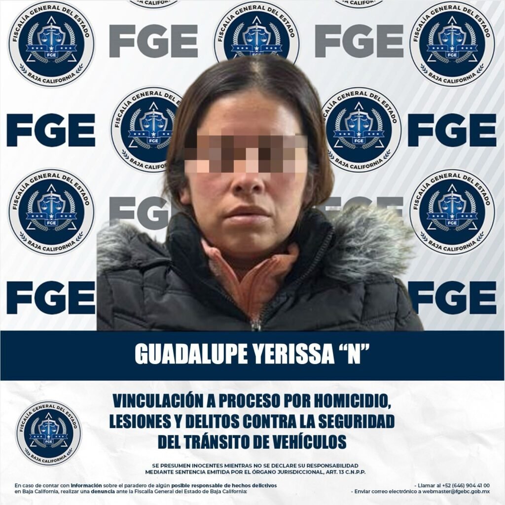 La Fiscalía Regional de Tijuana, a través de la Unidad de Investigación con Detenido, informa que fue vinculada a proceso Guadalupe Yerissa “N”, por su presunta responsabilidad en los delitos de homicidio, lesiones con dolo eventual y contra la seguridad del tránsito de vehículos.