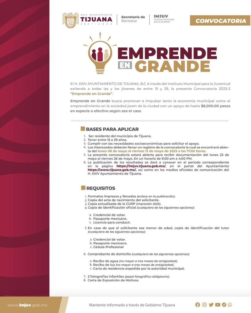 “Emprende en Grande busca promover e impulsar el desarrollo económico de las juventudes, además de otorgar apoyos económicos a las y los jóvenes que mantienen sus proyectos de emprendimiento en etapas de desarrollo, lanzamiento, operación o crecimiento”, dijo el funcionario.