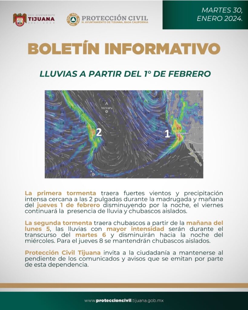 La primera tormenta traerá fuertes vientos y precipitación intensa cercana a las 2 pulgadas durante la madrugada y mañana del jueves 1 de febrero disminuyendo por la noche, el viernes continuará la presencia de lluvia y chubascos aislados.