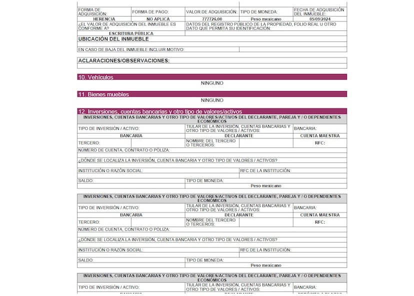 En su última declaración como secretario de Gobernación, antes de lanzarse a competir para ser abanderado de Morena a la presidencia de la República, ya no estaban los muebles, joyas y centenarios, ni la Suburban y tampoco la mayoría de sus propiedades. Solo le quedaban dos, una vivienda de 8.3 millones de pesos y un terreno rústico de un millón. Todo esto se va en su última declaración como senador, donde solo dice poseer dos terrenos recibidos en herencia en septiembre de 2024, que suman un total de 3.5 millones de pesos. Se preguntó al equipo de prensa del senador, pero a cierre de edición no hubo respuesta.