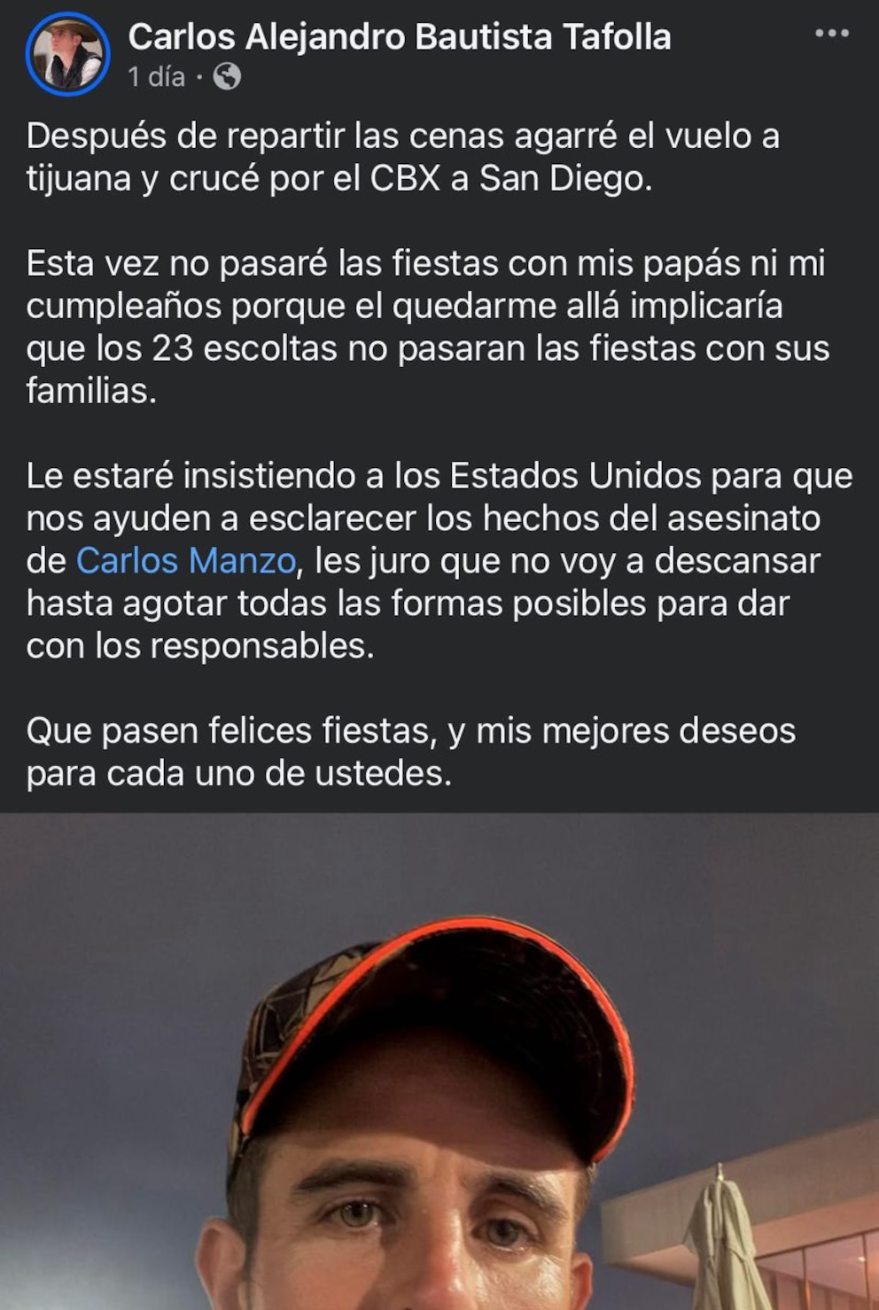Bautista Tafolla explicó que su estancia temporal en Estados Unidos respondió a razones de seguridad y logística, al permitir que los 23 escoltas asignados por autoridades federales y estatales pudieran pasar las fiestas decembrinas con sus familias. Señaló que permanecer en México durante ese periodo habría implicado mantener activo el dispositivo de seguridad personal.