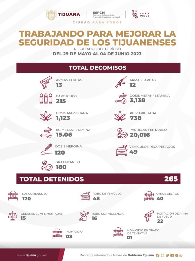 Del 29 de mayo al 4 de junio, agentes de la Policía Municipal detuvieron a 265 personas por diversos delitos, entre los que destacan 120 por narcomenudeo, 48 por robo a vehículos, 22 por portación de arma de fuego, 16 por robo con violencia y tres por homicidio.