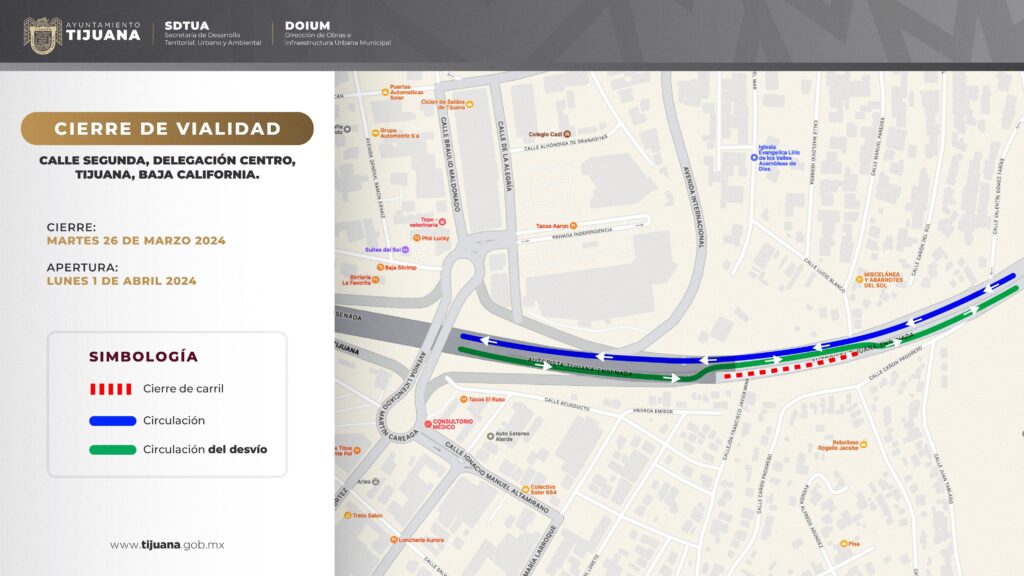 El Ayuntamiento de Tijuana en su actividad de adecuación de vialidades, realizará una obra de reparación sobre la calle segunda a la altura del callejón Francisco Javier Mina, a partir de la colonia Soler hacia la zona centro, desde el martes 26 de marzo al lunes primero de abril.