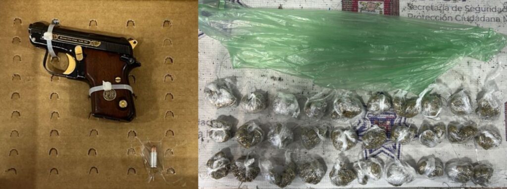 Al efectuar una inspección precautoria en su persona, le fue asegurada una pistola calibre .25, abastecida con un cartucho útil, así como 30 envoltorios de plástico que contenían en su interior lo que parecía ser marihuana.