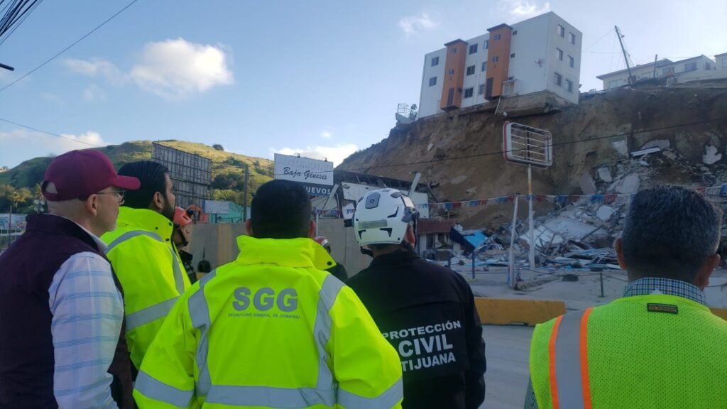 Por instrucciones de la alcaldesa Montserrat Caballero Ramírez, personal de Protección Civil Municipal permanece monitoreando el movimiento de tierra, luego del colapso de uno de los edificios en riesgo, ubicados en el fraccionamiento La Sierra.