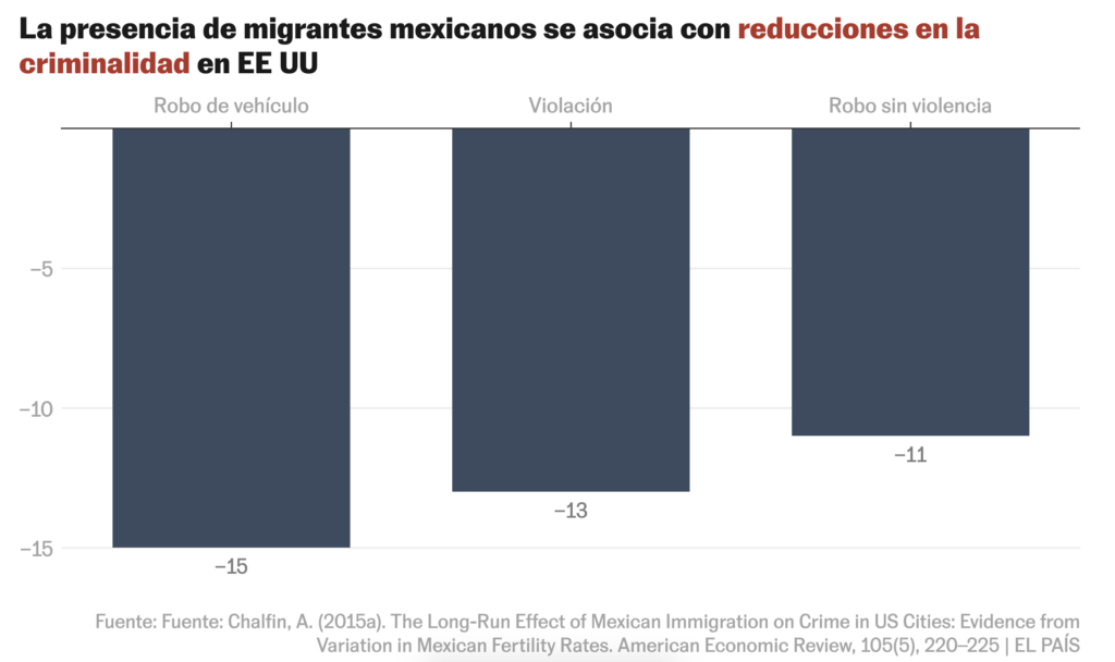 Más migración implica menos delincuencia, de acuerdo con una investigación publicada en el ILR Review. “Por cada punto porcentual de incremento en el porcentaje de inmigrantes mexicanos, la criminalidad disminuye”, se lee en análisis de Ríos. El robo de vehículos cae un 15%, las violaciones bajan un 13% y los robos sin violencia, un 11%. “Los migrantes tienen una probabilidad más baja de cometer delitos que la población nativa, precisamente porque ellos van a trabajar y lo último que quieren es tener problemas con la ley”, explica la académica.