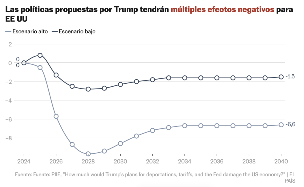 Ríos envió un análisis más amplio que el que Sheinbaum presentó en su conferencia de prensa. Esa versión incluye estimaciones del impacto directo de las políticas de Trump. Si el próximo Gobierno deportara de 1,3 a 8,3 millones de inmigrantes y, además, impusiera aranceles del 10% a las importaciones de México, China y Canadá, la economía estadounidense se contraería y habría más inflación. En 2028, el PIB real de Estados Unidos caería un 2,8%, en un escenario optimista, y hasta un 9,7%, en uno pesimista. El empleo se desplomaría en ese mismo año de forma similar, de un 2,7% hasta un 9%. El nivel de precios subiría entre 4,1 y 7,4 puntos en 2026, al término de su segundo mandato, según cálculos del Instituto Peterson. “Al tratarse de datos de académicos estadounidenses en su mayoría, no se puede argumentar que estén sesgados a favor de México”, afirma Ríos.