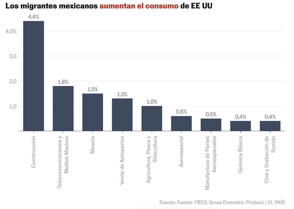 “Si los trabajadores mexicanos dejaran de consumir en Estados Unidos, la economía se contraería en 1 punto del PIB”, subraya el análisis. Esto es especialmente relevante por el peso que tiene el consumo de la diáspora mexicana y porque evidencia cómo ayuda a fortalecer el mercado estadounidense, señala Ríos. “Es el equivalente a destruir el valor generado por la totalidad de la agricultura, la pesca y la silvicultura de ese país”, asegura. El consumo de los migrantes de México tiene, además, un peso económico mayor que la industria del cine, la química básica, la manufactura de partes espaciales y los aerotransportes, de acuerdo con datos del Journal for Health Economics.