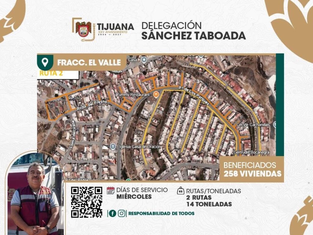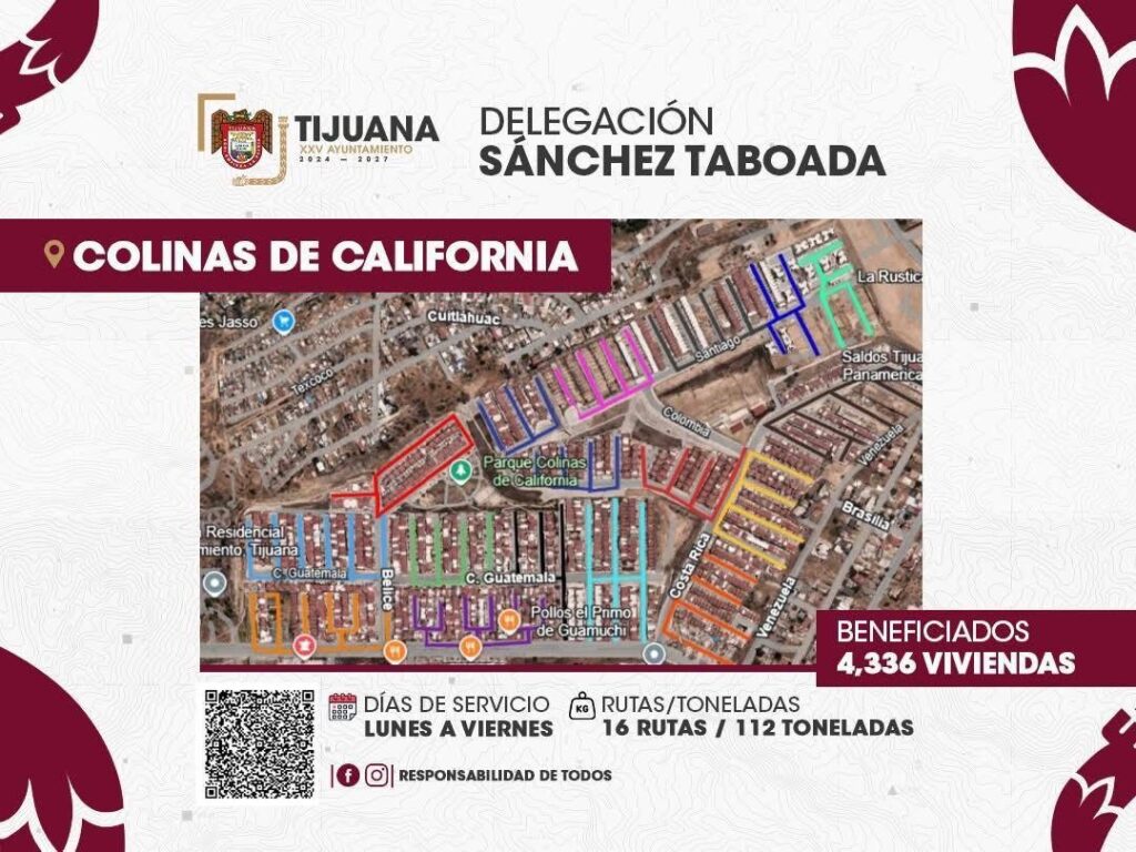 En la Delegación Sánchez Taboada, las colonias y fraccionamientos beneficiados con nuevas rutas y días de recolección son los siguientes: