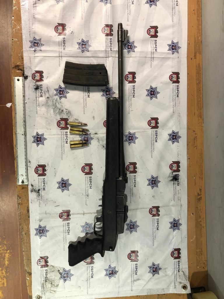 Policías municipales y personal militar interceptaron un vehículo donde dos presuntos integrantes de la delincuencia organizada trasladaban un armamento entre fusiles de alto calibre y pistolas.