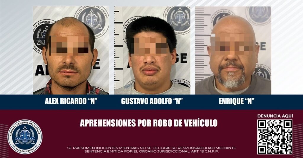 La Fiscalía General del Estado, a través de la Agencia Estatal de Investigación (AEI) de la Zona Tijuana, logró la detención de tres imputados, por hechos relacionados con el delito de robo de vehículos.
