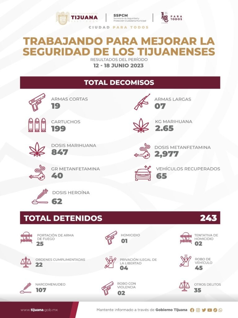 En la segunda semana de junio, la Secretaría de Seguridad y Protección Ciudadana Municipal (SSPCM), detuvo a 243 personas por diversos delitos, cifras donde destacan una por homicidio, dos en grado de tentativa de homicidio, cuatro por privación ilegal de la libertad, así como 25 por portación de arma de fuego.