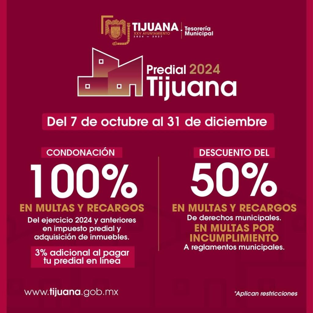 El XXV Ayuntamiento de Tijuana encabezado por el Presidente Municipal, Ismael Burgueño Ruiz, exhorta a las y los tijuanenses a aprovechar la condonación de multas y recargos municipales, correspondientes al ejercicio fiscal 2024 y anteriores.