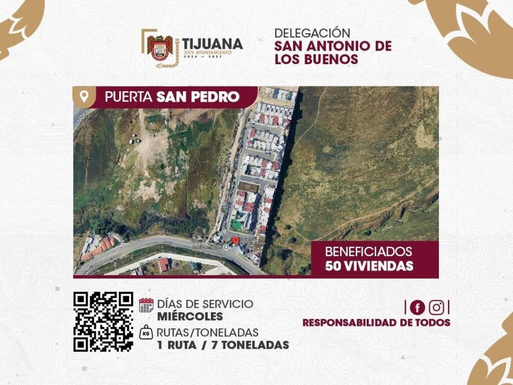 En San Antonio de los Buenos, se incorporaron nuevas rutas en distintas colonias y fraccionamientos, con el propósito de ampliar la cobertura y ofrecer un servicio de calidad a las familias tijuanenses. Las rutas y días de recolección quedaron distribuidos de la siguiente manera: