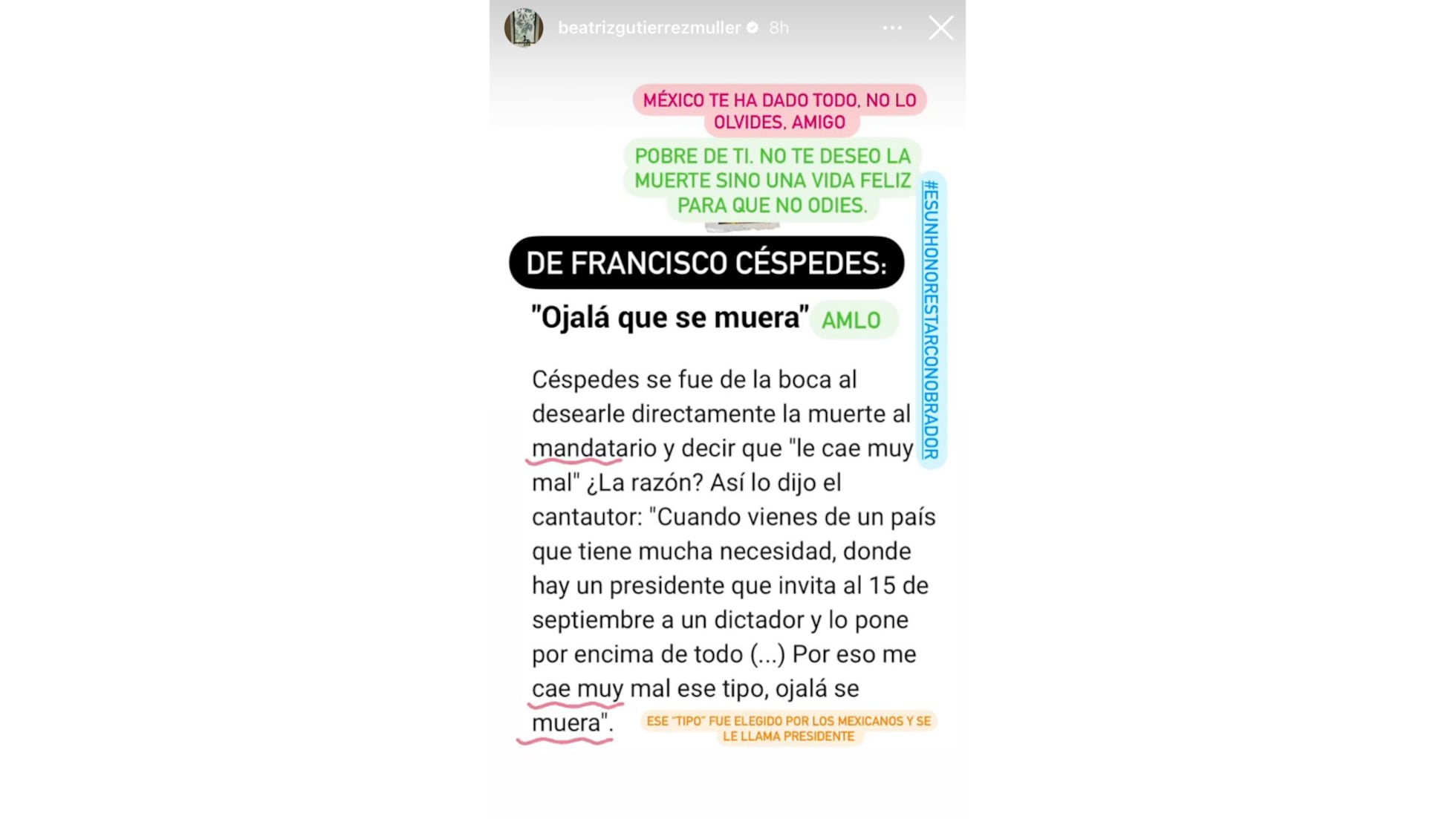 El cantante Francisco Céspedes arremetió contra el presidente López Obrador después de un concierto en Hermosillo, Sonora. El compositor reprochó al mandatario que el año pasado invitara a Miguel Díaz Canel, presidente de Cuba, a la celebración de las fiestas patrias como una de las principales personalidades internacionales. “Cuando uno viene a un país que tiene mucha necesidad, cuando hay un presidente que invita el 15 de septiembre a un dictador cubano y lo pone por encima, no sé o sea, tú puedes invitar a cualquier presidente, pero no ponerlo como el máximo, porque por eso entonces me cae muy mal ese tipo y ojalá que se muera”, afirmó Céspedes que es ciudadano cubano y mexicano.