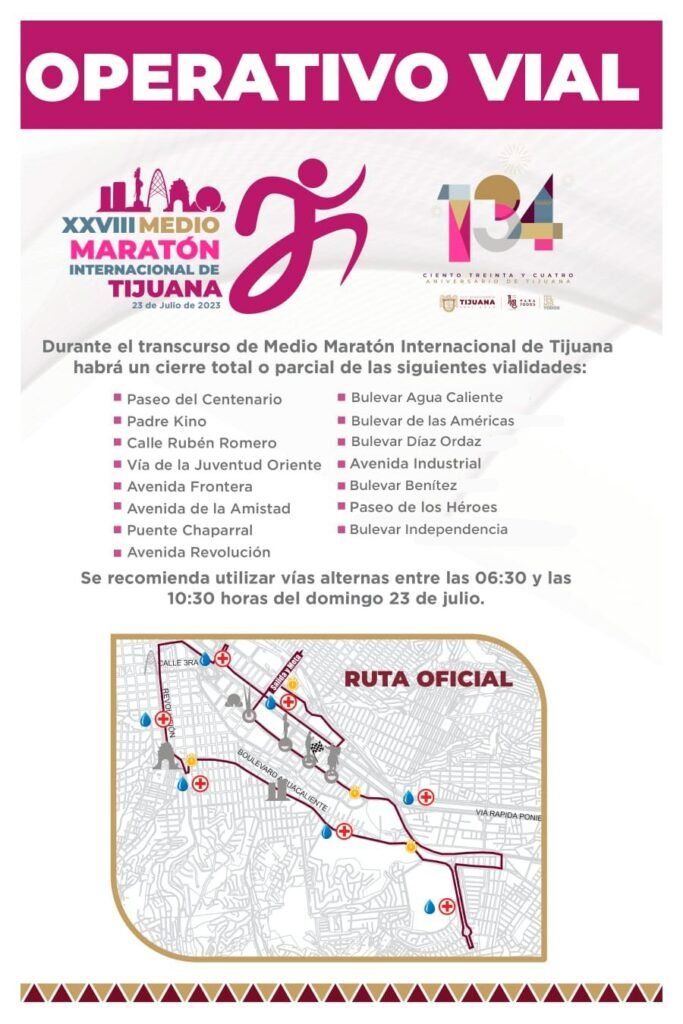 El XXIV Ayuntamiento que encabeza la alcaldesa Montserrat Caballero Ramírez, implementará el domingo 23 de julio un operativo vial a lo largo de la ruta de 21.0975 kilómetros para preservar la seguridad de los seis mil competidores inscritos al 28 Medio Maratón Internacional de Tijuana.