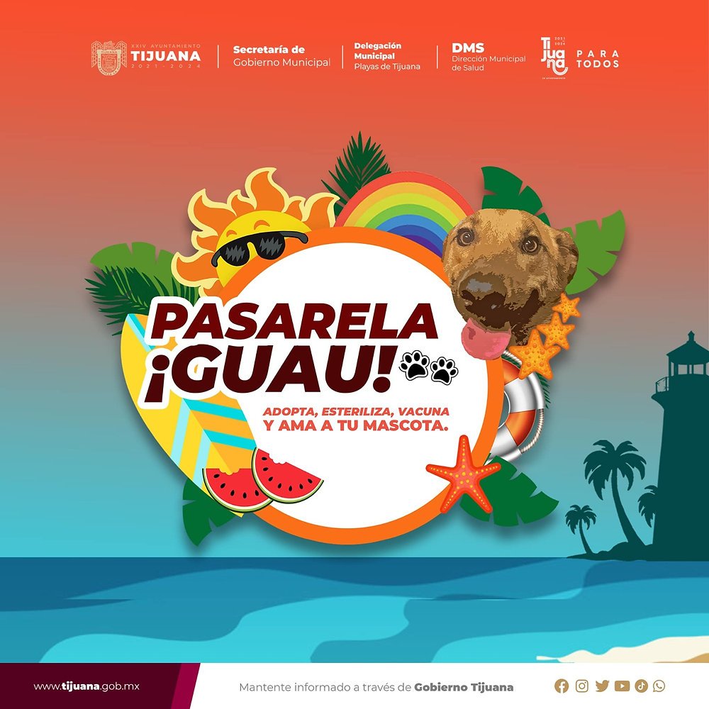 Con el objetivo de fomentar el respeto a los derechos de los animales, la adopción y la tenencia responsable de mascotas, el Ayuntamiento de Tijuana, a través de la Delegación Municipal de Playas de Tijuana, invita a participar en la “Pasarela Guau” este sábado 5 de agosto en el Malecón de Playas.