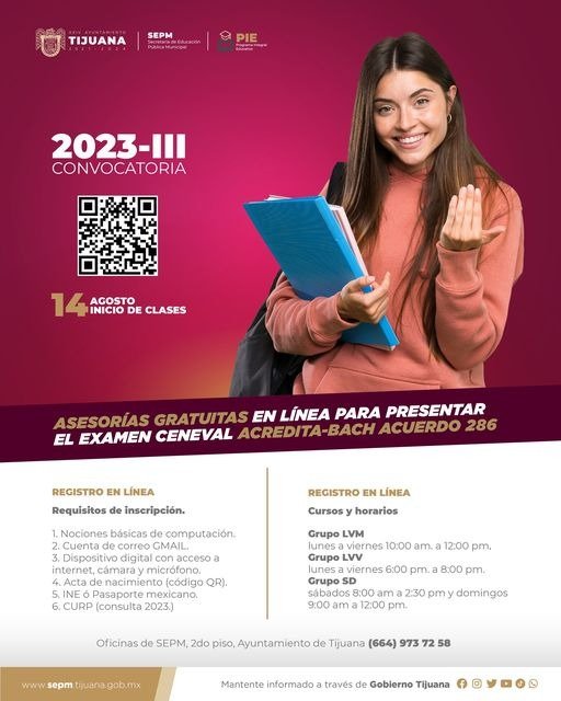 El XXIV Ayuntamiento que encabeza la alcaldesa Montserrat Caballero Ramírez, a través de la Secretaría de Educación Pública Municipal (SEPM), invita a la población mayor de 18 años, interesada en acreditar el bachillerato, a tomar las asesorías gratuitas, para recibir su certificado de educación media superior.
