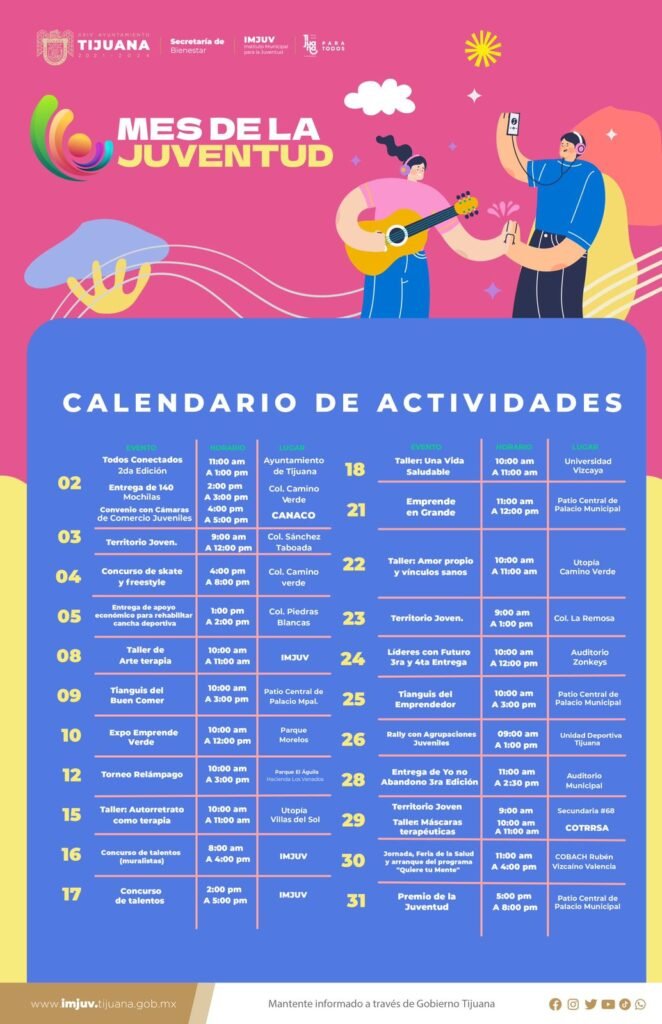 El calendario completo del Mes de la Juventud está disponible en las redes sociales de la paramunicipal y el Ayuntamiento de Tijuana y como un incentivo más, los asistentes recibirán una tarjeta o cuponera y en caso de acumular ocho “puntos” o asistencia, entrarán a la rifa de tres equipos de cómputo.