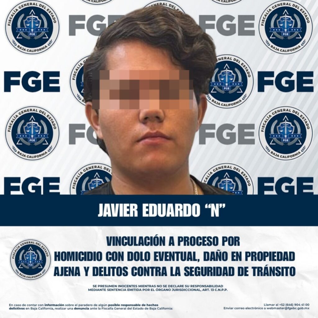 La Fiscalía Regional de Tijuana informa que, a través de las labores de la Unidad de Investigación con Detenido, Zona Tijuana, se logró obtener la vinculación a proceso y la imposición de la medida cautelar de prisión preventiva oficiosa en contra de Javier Eduardo “N”, por su probable responsabilidad en los delitos de homicidio cometido con dolo eventual, daño en propiedad ajena y delitos contra la seguridad de hechos de tránsito de vehículos.
