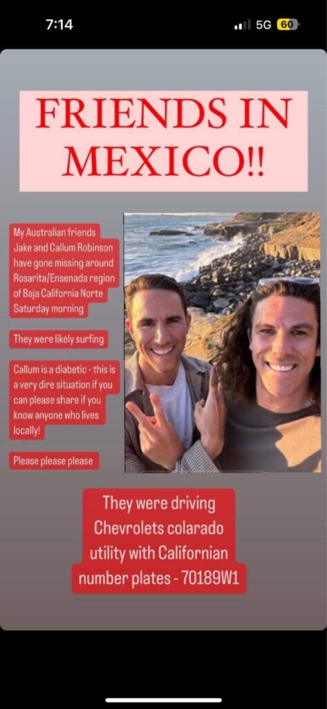 El mensaje de Robinson disparó las alarmas. La mujer explicaba que, entre sus motivos de preocupación, está que Callum Robinson, de 33 años, es diabético, por lo que necesita medicación. El mayor de los dos hermanos vive en San Diego, donde trabaja como jugador de Lacrosse. Ahí había llegado a visitarlo Jake, de 30 años, que es médico en Australia. Ambos son originarios de Perth, una ciudad en la costa oeste australiana. Los Robinson iniciaron el pasado jueves junto a su amigo Jack Carter, también de 30, un viaje de surf hacia México. Es un trayecto de apenas dos horas entre California y Punta San José, donde los jóvenes estaban surfeando ese sábado.