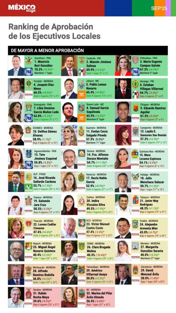 El contraste con otras entidades es evidente. Gobernadores como Mauricio Kuri González en Querétaro (70.3%), Manolo Jiménez Salinas en Coahuila (69.9%) y María Eugenia Campos Galván en Chihuahua (67.2%) se ubican en los primeros lugares de aprobación, consolidando liderazgos con una amplia distancia respecto a Avila Olmeda.
