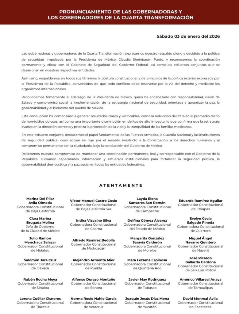 Ante estos acontecimientos, el Gobierno de México reiteró su condena a la acción militar y reafirmó su apego a los principios de no intervención y autodeterminación de los pueblos, postura que fue retomada y respaldada de manera explícita por las gobernadoras y gobernadores en el pronunciamiento conjunto.