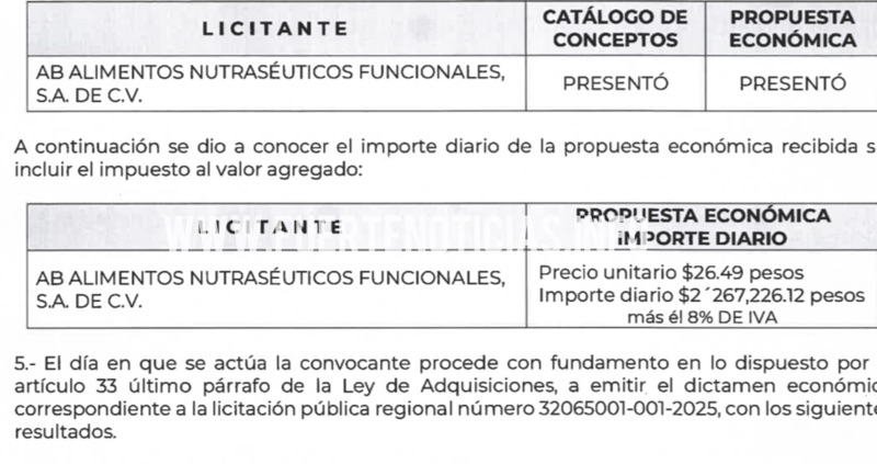De acuerdo con un reportaje de Alejandro Cárdenas, publicado en el portal Fuerte Noticias este viernes, documentos revelan que la empresa AB Alimentos Nutracéuticos Funcionales, S.A. de C.V. fue la adjudicataria de la licitación pública regional 32065001-001-2025, encargada del suministro de desayunos escolares en todas las primarias públicas del Estado.