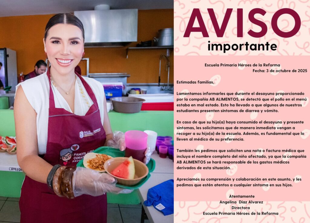 “Las autoridades sanitarias informan que alumnas y alumnos de distintas escuelas primarias de Tijuana que mostraron síntomas de intoxicación alimentaria tras consumir alimentos proporcionados por la empresa contratada para la preparación de alimentos escolares, evolucionan favorablemente y se encuentran fuera de peligro”, dijo la gobernadora Marina del Pilar en sus redes sociales.