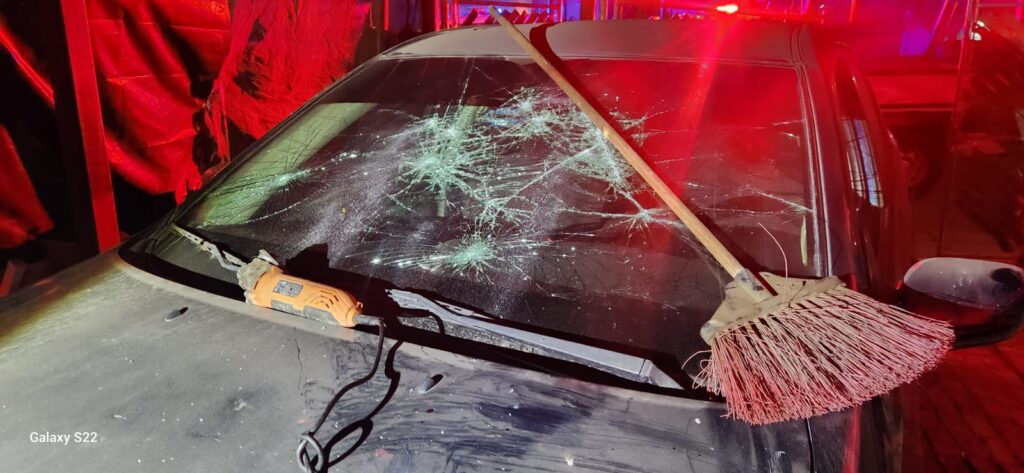 Posteriormente, habría utilizado una herramienta para causar daños al parabrisas frontal de una camioneta Toyota Matrix, color azul, modelo 2003, que se encontraba sin placas de circulación.