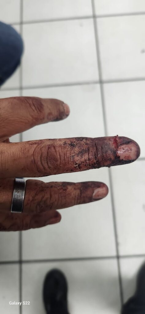 Como resultado de la agresión, el hombre presentó lesiones visibles en el dedo medio de la mano derecha, el labio inferior, así como moretones en ambos ojos.