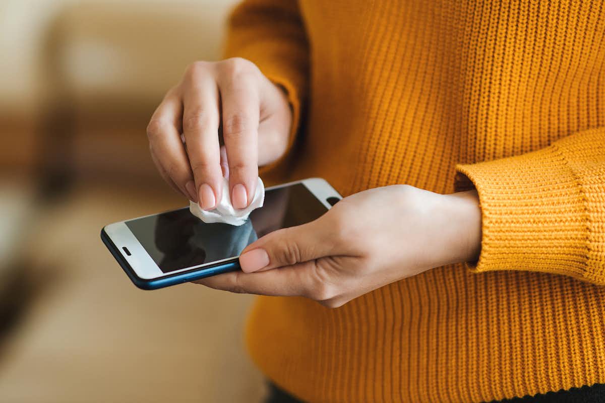 Lo mejor es usar toallitas o esprays a base de alcohol. Tienen que contener al menos un 70 % de alcohol para desinfectar las carcasas de los teléfonos y las pantallas táctiles, y hay que aplicarlas todos los días si es posible.