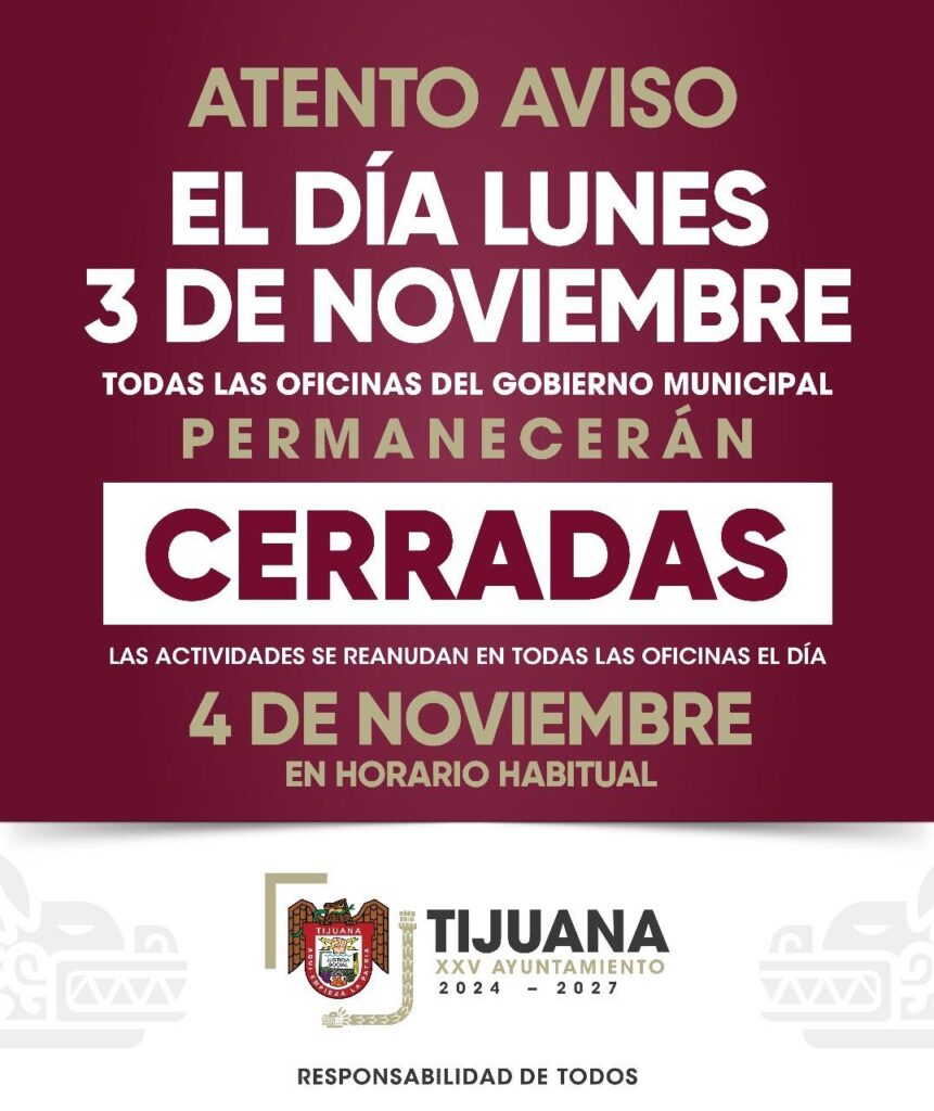 El XXV Ayuntamiento de Tijuana informa a la ciudadanía que el próximo lunes 3 de noviembre será día inhábil para el personal de la administración pública municipal.
