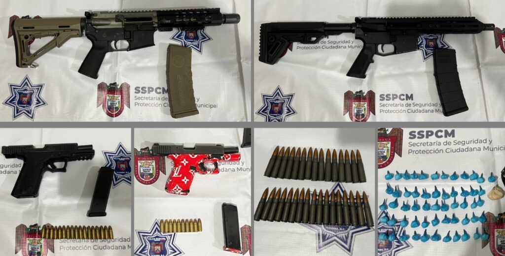 Mientras que el decomiso corresponde a dos armas tipo fusil calibre .223 y dos armas tipo pistola calibre 9 milímetros abastecidas con 17 y 10 cartuchos útiles cada una, así como una mochila que contenía en su interior 32 cartuchos útiles calibre 7.62 X 39 y 56 envoltorios con una sustancia granulada de lo que parecía ser “cristal”, y un envoltorio más color blanco de plástico con el mismo contenido.