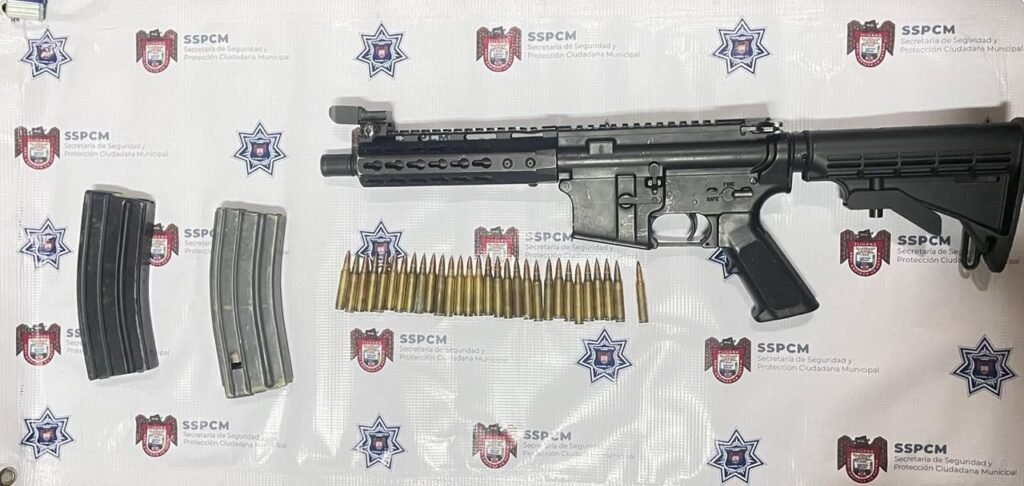 Posterior a la agresión y apoyo a los compañeros agredidos, grupos especiales de la corporación municipal lograron ubicar al detenido en el fraccionamiento Los Valles, en posesión de un fusil AR15, con dos cargadores de metal, uno de ellos abastecido con 30 cartuchos útiles y un chaleco balístico.